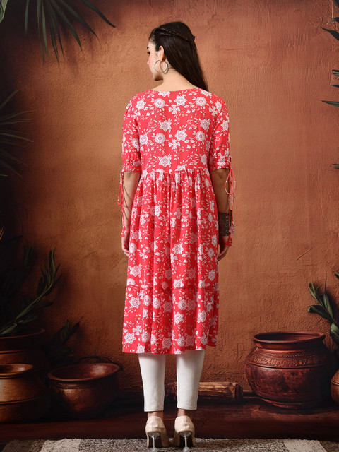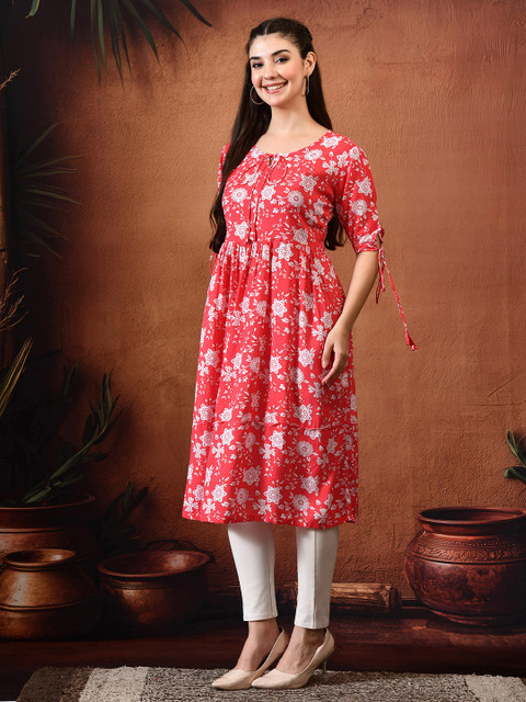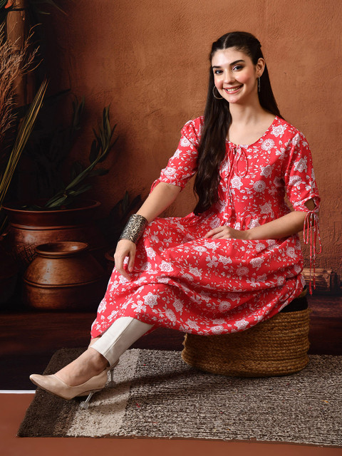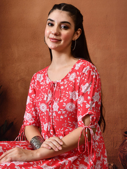 - Red and red floral print a-line dress