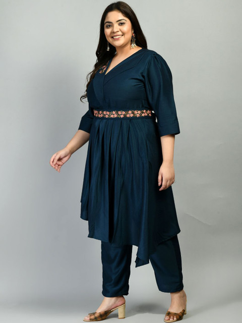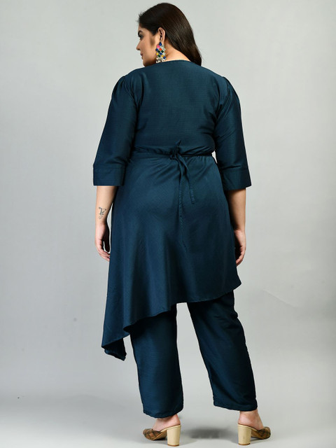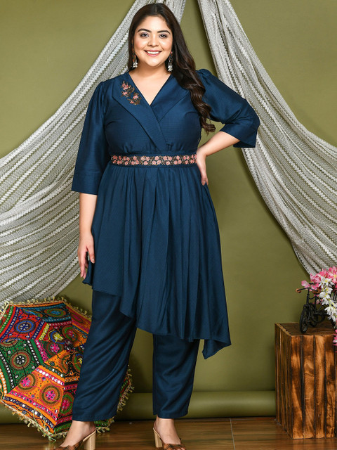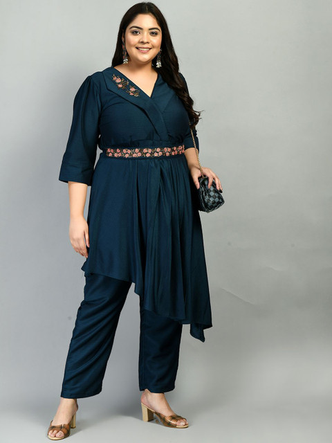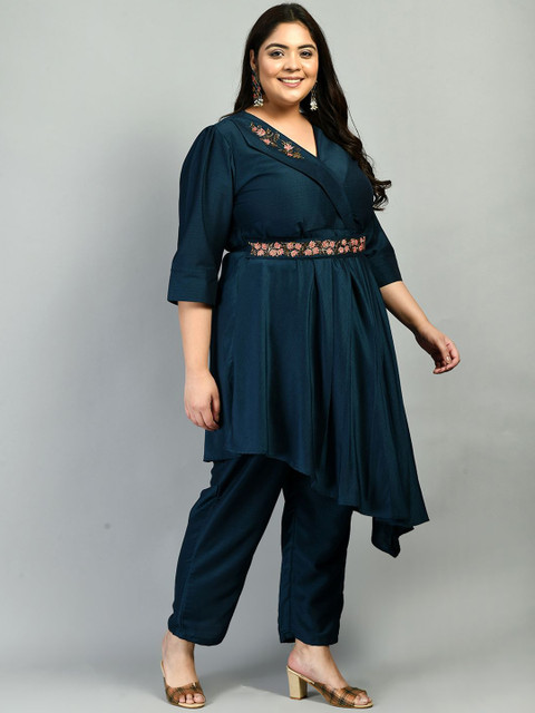 Teal blue floral embellished Tunic, has v-neck, three quarter sleeves, slip-on closure regular waist hem