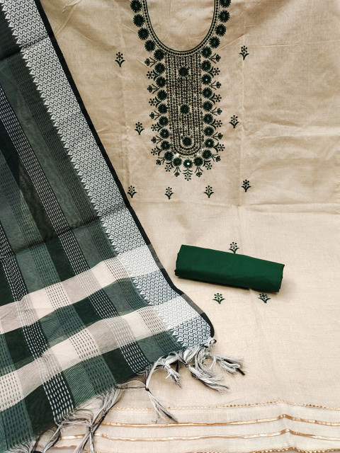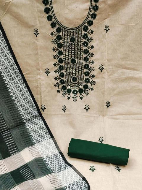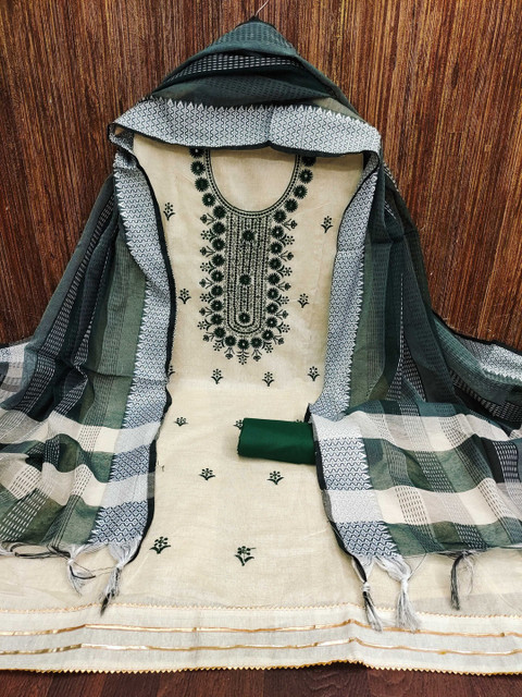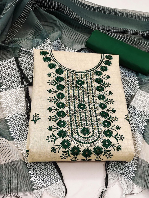 Off white and green embroidered unstitched dress material