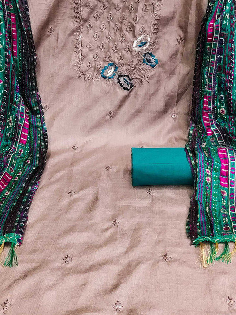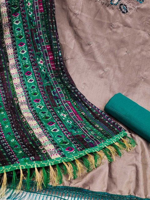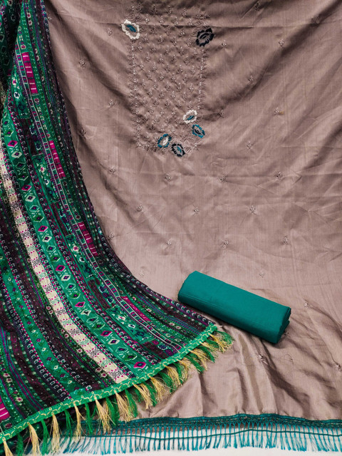 Replenish Your Wardrobe This Unstitched Wrinkle Free Dress Material Set By Dhaaga Ghar Brand. Embroidered Design With Trendy Colors Makes It A Must Have This Season. Crafted With Perfection, This Beautifully Embroidered Set Will Offer You Superb Comfort All Day Long. Top Fabric : Coco Silk. In The Box : 1 Top – 1 Bottom – 1 Dupatta. Wash Care : Home Washable. Color : Grey & Green. This Unstiched Trendy Chudidar Dress Can Be Used For Festive,Wedding,Office And Casual Wear.