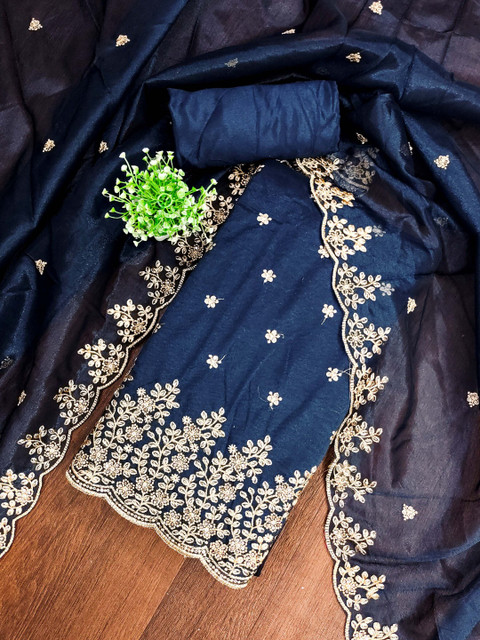 Navy blue and teal embroidered unstitched dress material