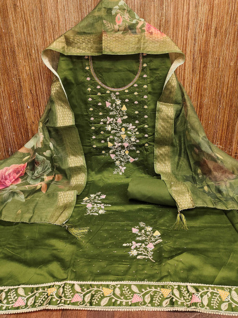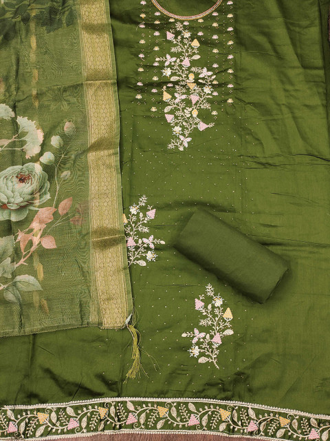 Olive green and green embroidered unstitched dress material