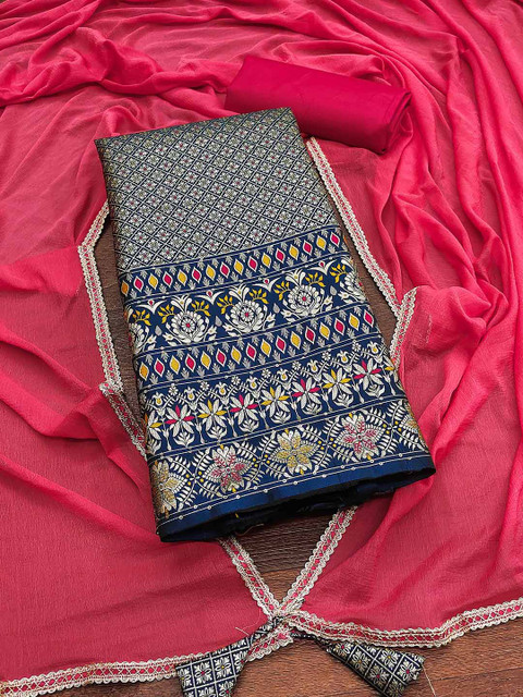 Replenish Your Wardrobe This Unstitched Wrinkle Free Dress Material Set By Dhaaga Ghar Brand. Weaving Design With Trendy Colors Makes It A Must Have This Season. Crafted With Perfection, This Beautifully Weaving Set Will Offer You Superb Comfort All Day Long. Top Fabric : Banarasi Jacquard. In The Box : 1 Top – 1 Bottom – 1 Dupatta. Wash Care : Home Washable. Color : Navy Blue & Pink. This Unstiched Trendy Chudidar Dress Can Be Used For Festive,Wedding,Office And Casual Wear.