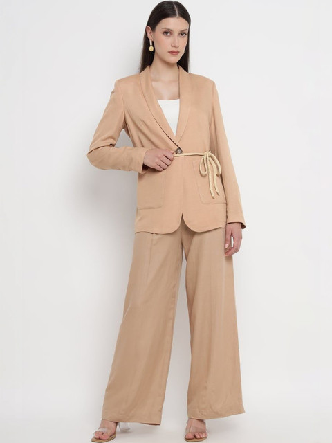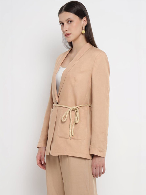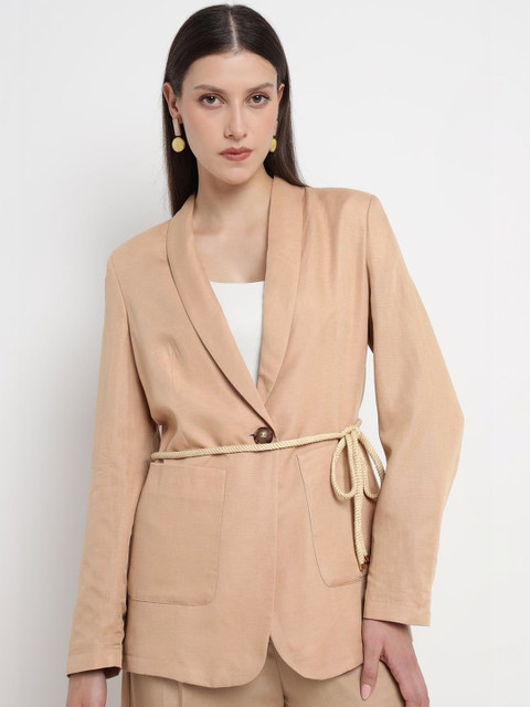 Beige solid relaxed-fit single-breasted casual blazer, has a notched lapel collar, button closure, long sleeves, two pockets and vent less back hem