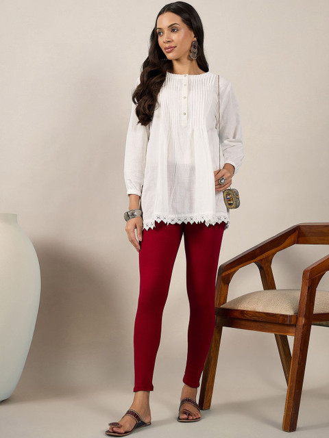 Maroon solid ankle-length leggings, has an elasticated waistband with slip-on closure