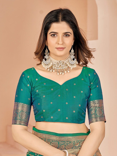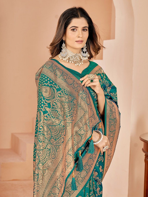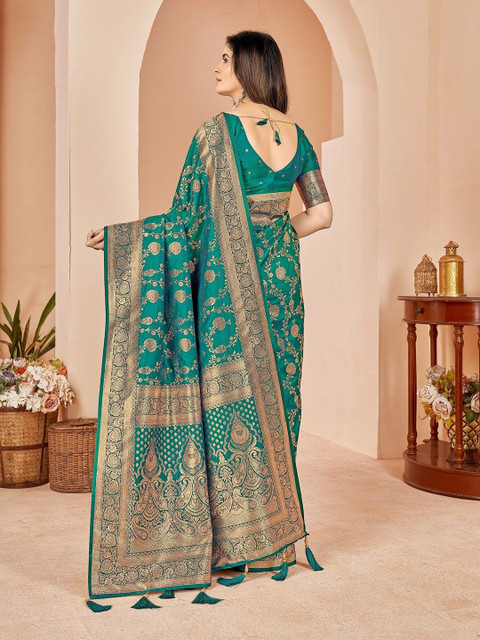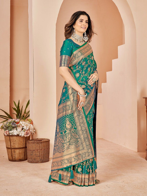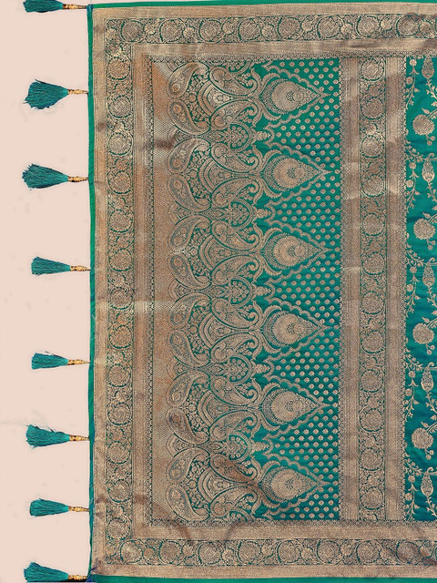 - Green and gold-toned kanjeevaram saree