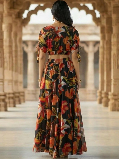 Black and printed ready to wear blouse, has a v-neck, short sleeves, black printed ready to wear lehenga, flared hem