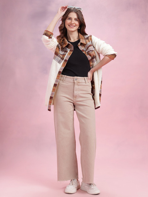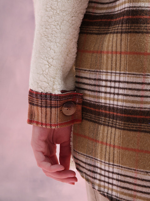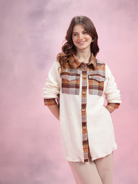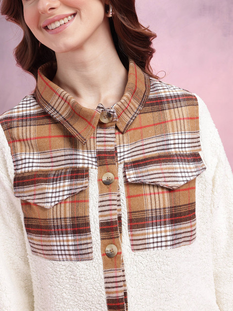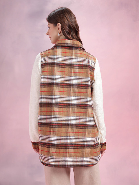Off white and brown checked tailored jacket, has a spread collar, 2 pockets ,has a zip closure, long sleeves, curved hemline, polyester lining