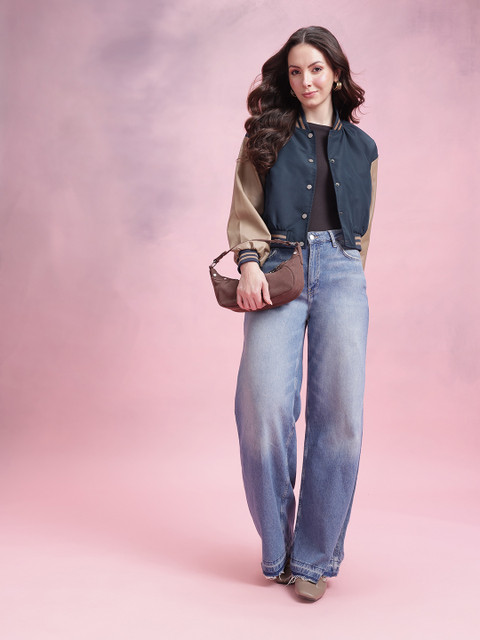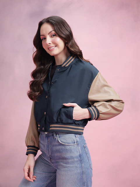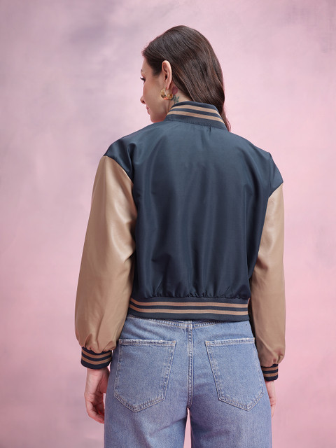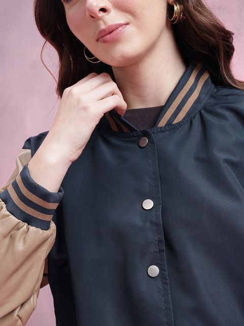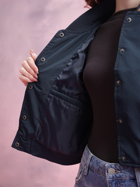Navy blue solid bomber jacket, has a stand collar, 2 pockets, snap button closure, long contrast sleeves, straight hemline, polyester lining with inner pocket