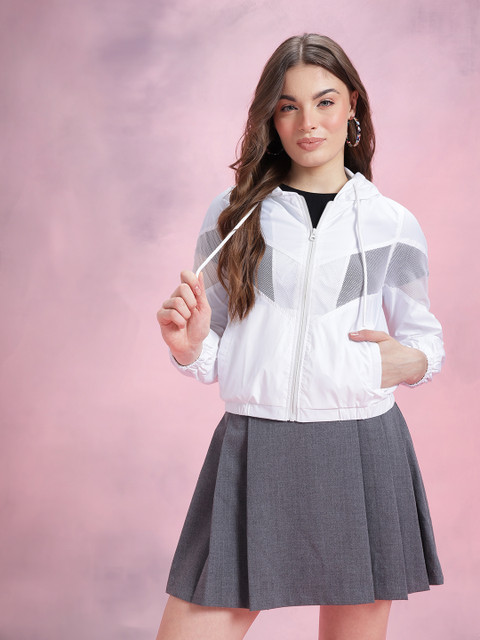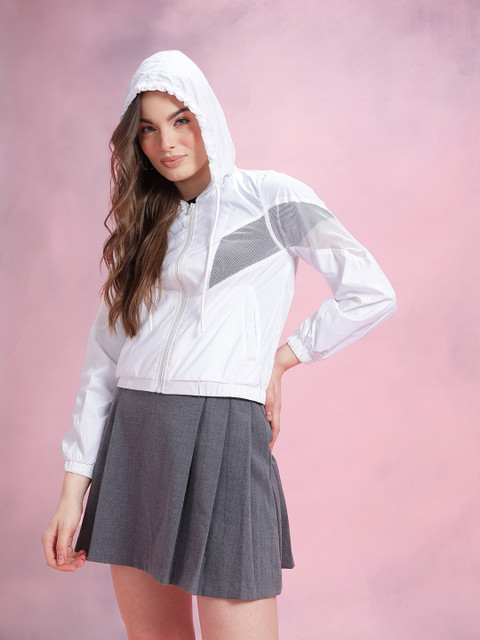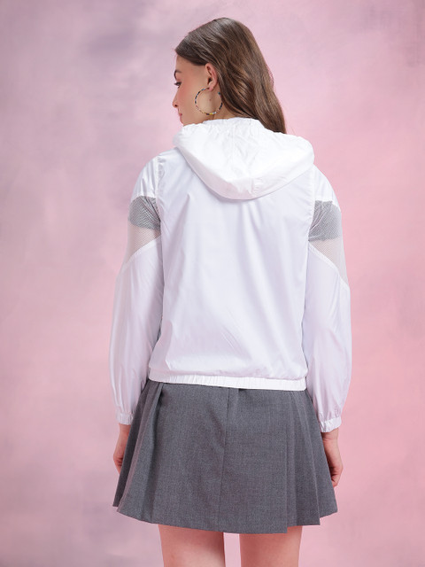 White solid bomber, has a hood, 2 pockets ,has a zip closure, long sleeves, straight hemline, has mesh inserts without lining engineered with no technology