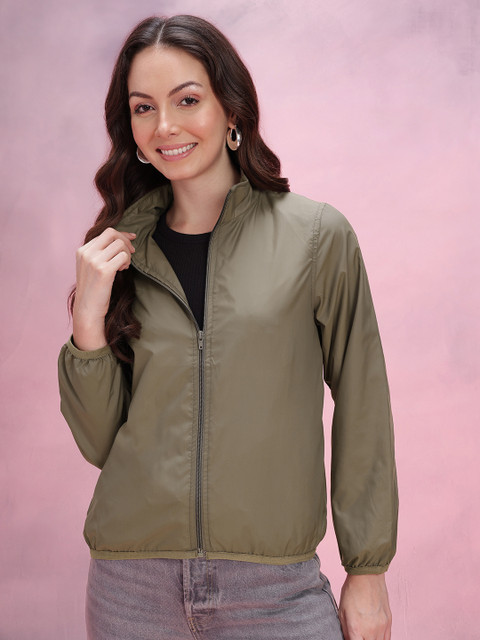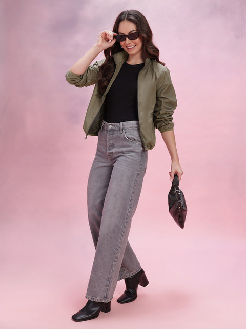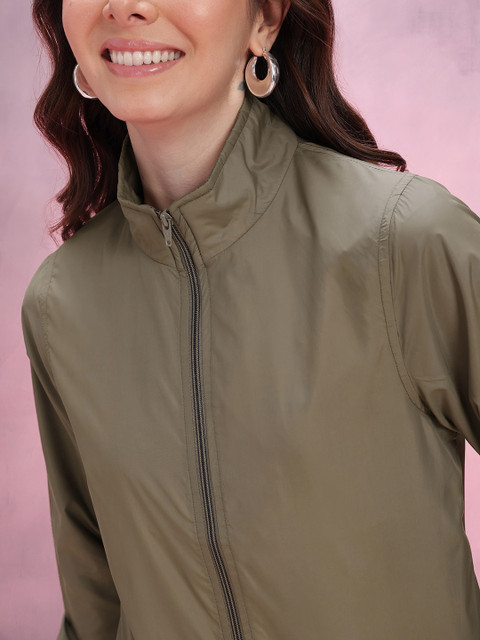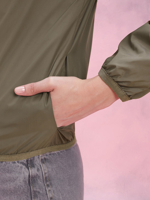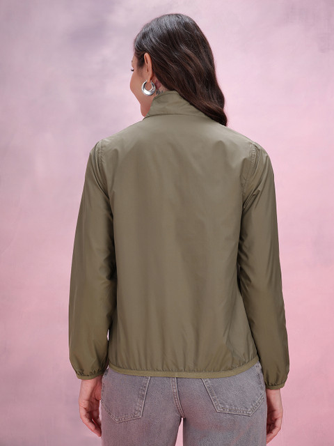 Olive green solid bomber, has a mock collar, 2 pockets ,has a zip closure, long sleeves, straight hemline, polyester lining