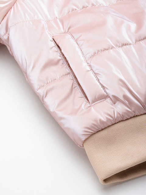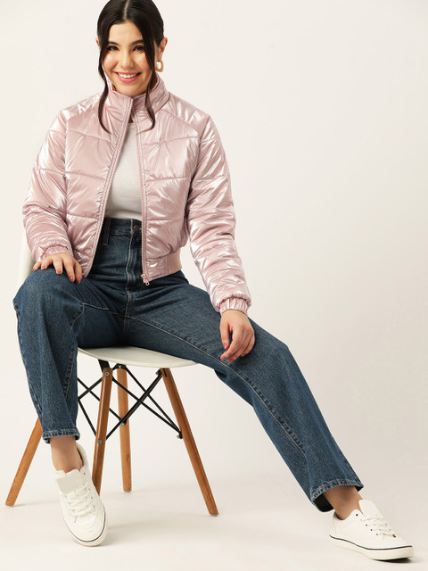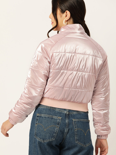 Metallic pink solid puffer jacket, has a mock collar, 2 pockets, zip closure, long sleeves, straight hemline, polyester lining
