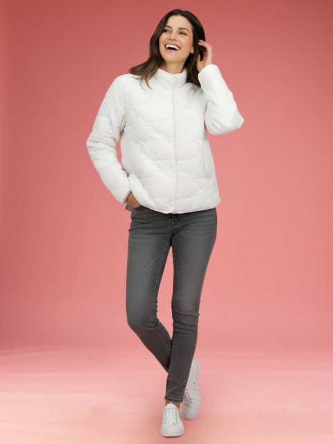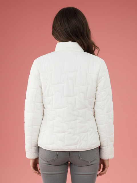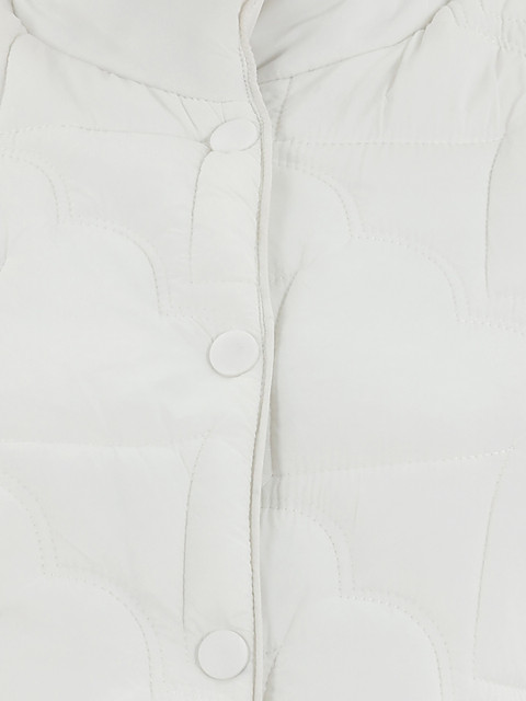 White solid quilted jacket, has a mock collar, 3 pockets ,has a snap button closure, long sleeves, straight hemline, polyester lining