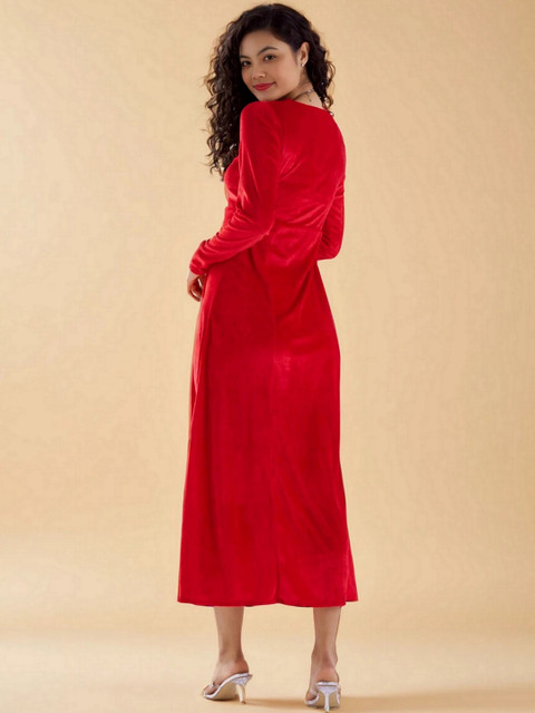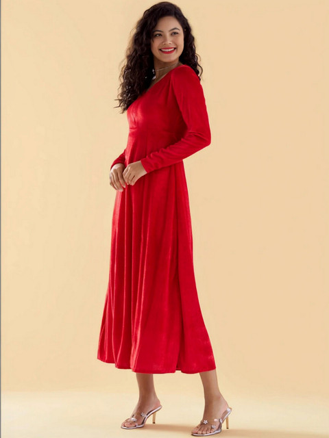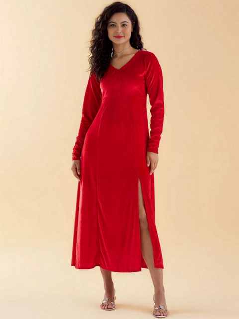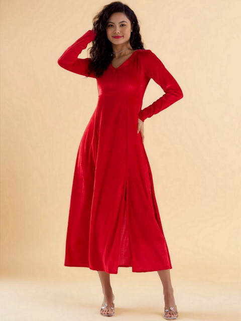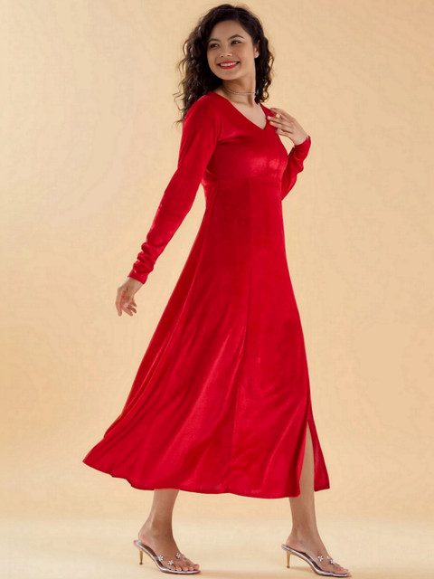 DressBerry Women’s Red Velvet Maxi Dress: V-neck, full sleeves, fit-and-flare silhouette, no belt. Elegant, comfortable, perfect for parties and evenings.
