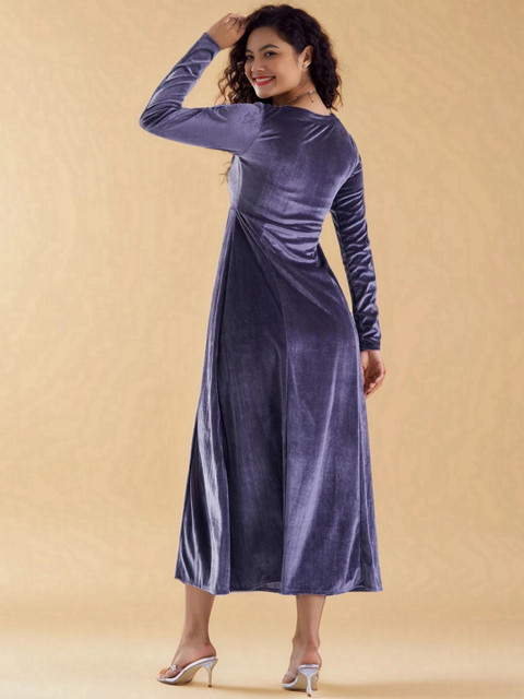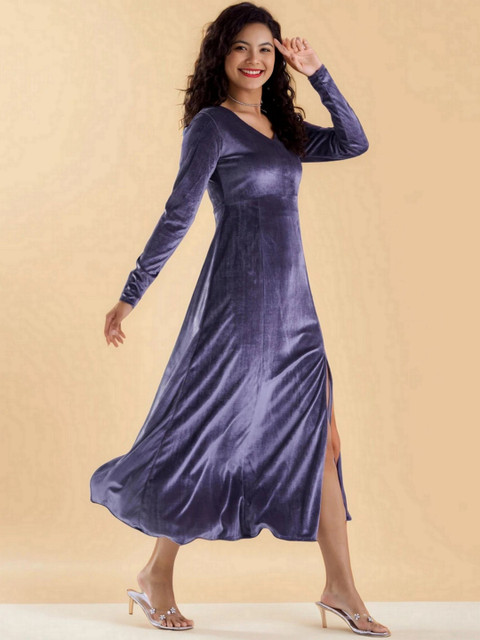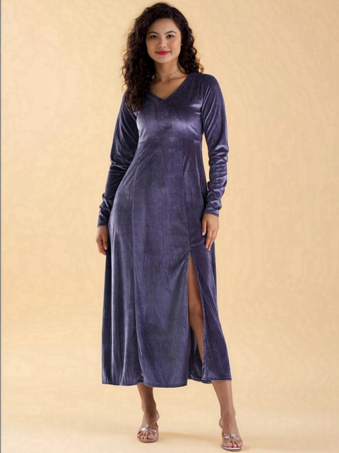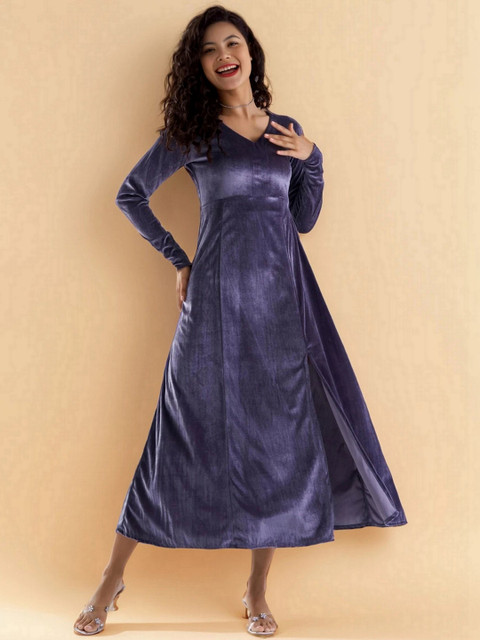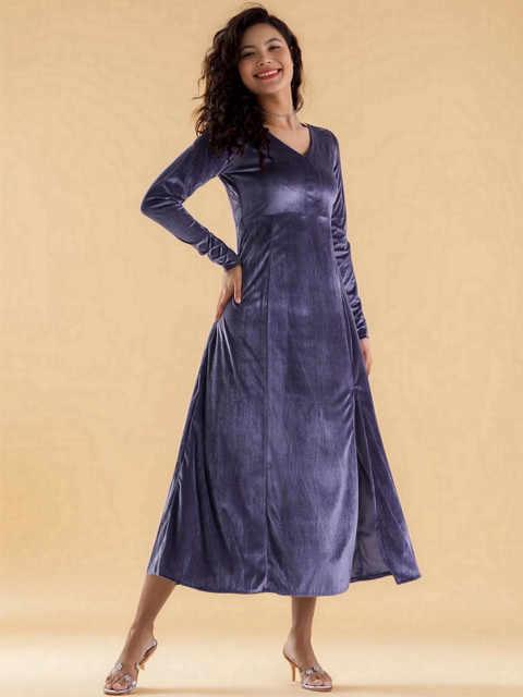 DressBerry Women’s Velvet Maxi Dress in Steel Grey: V-neck, full sleeves, solid, fitandflare, beltless for a sleek silhouetteversatile, elegant evening wear.