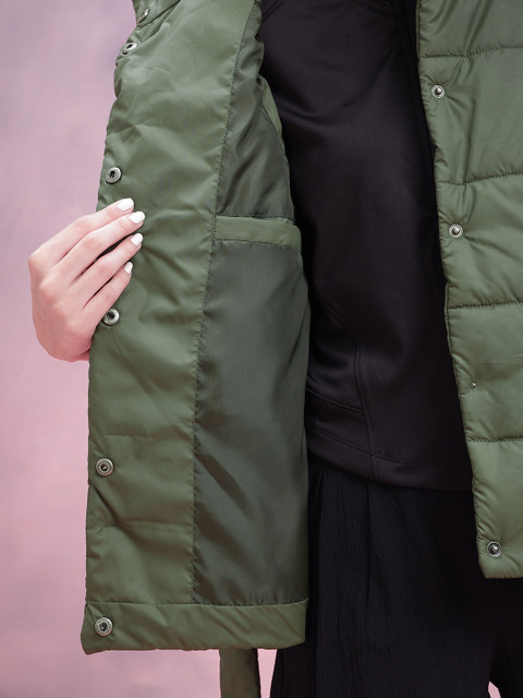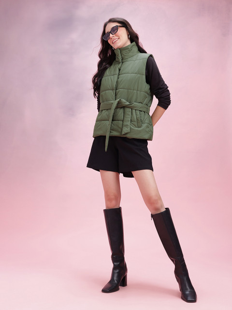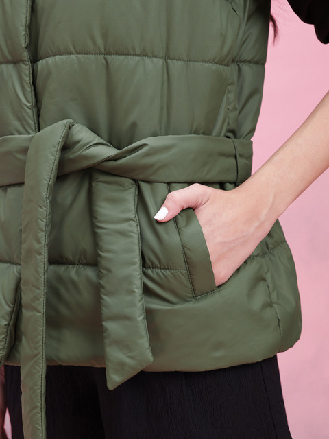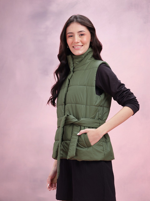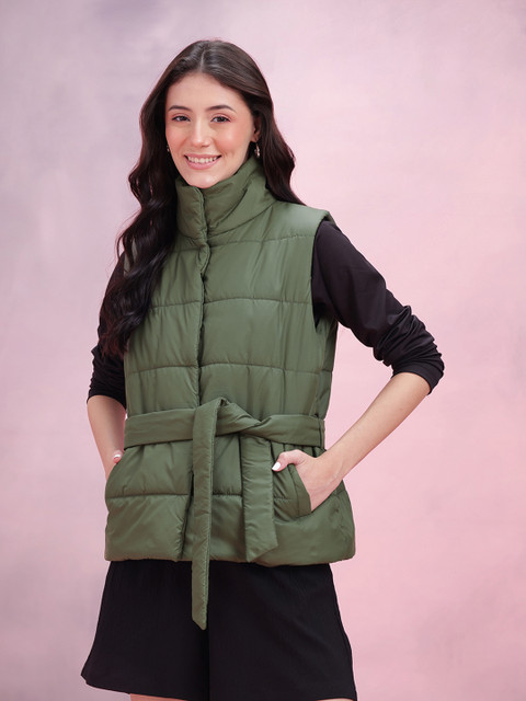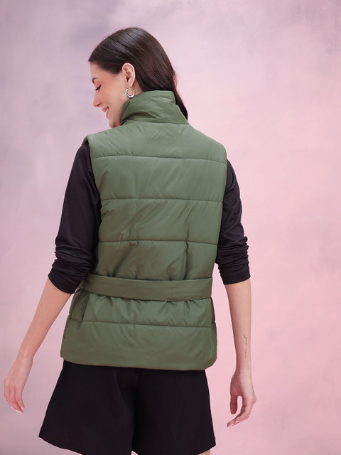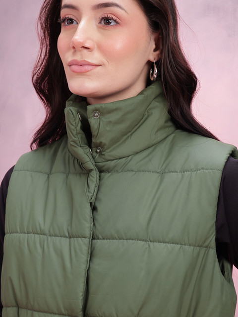 Olive green solid gilet, has a mock collar, 2 pockets ,has a snap button closure, sleeveless, straight hemline, polyester lining