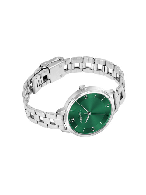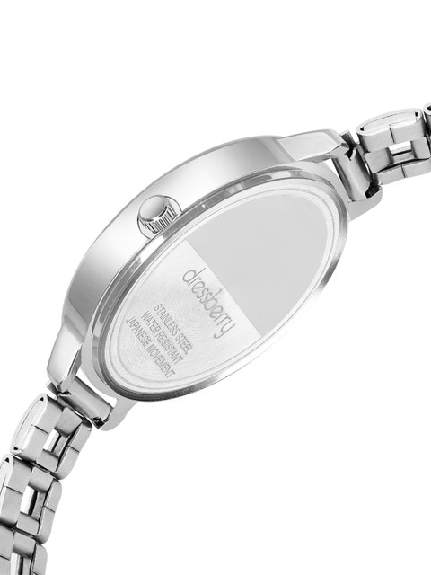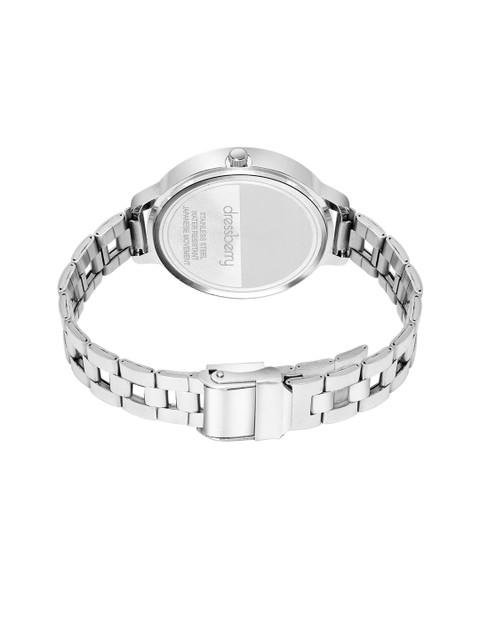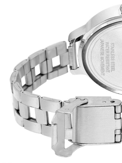 Strap Style: silver toned, regular, stainless steel strap with a foldover