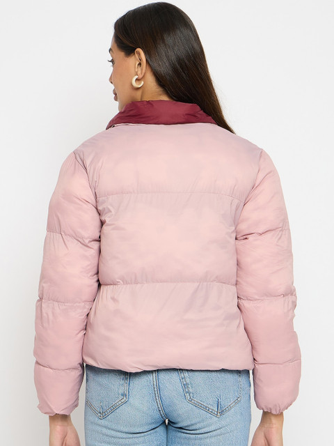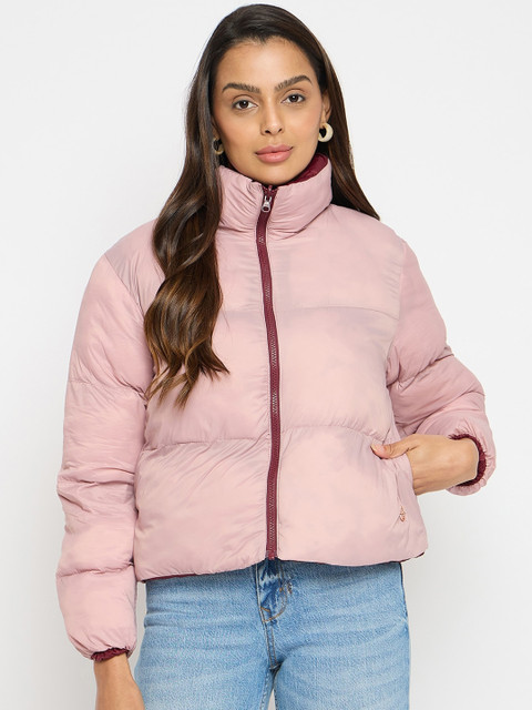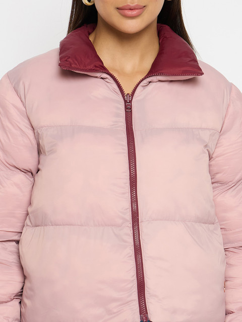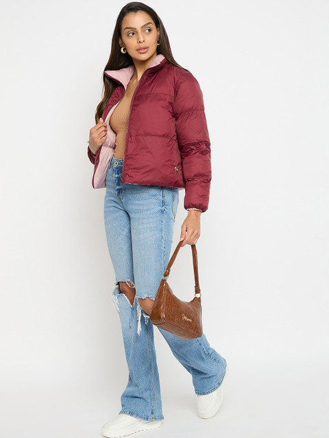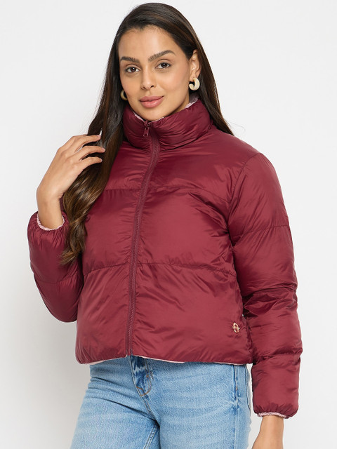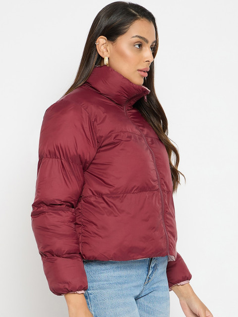 Maroon solid puffer jacket with faux fur trim, has a mock collar, 3 pockets ,has a zip closure, long sleeves, straight hemline, polyester lining