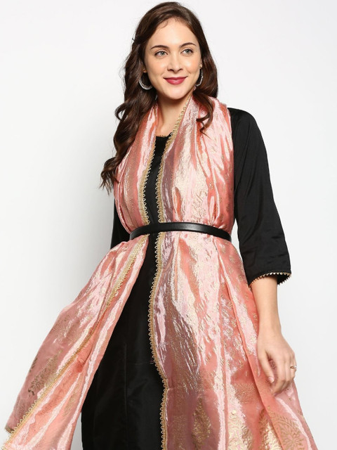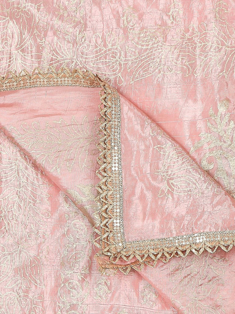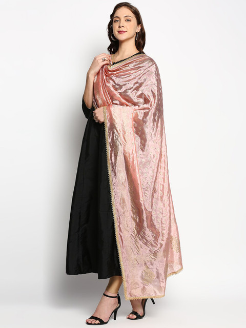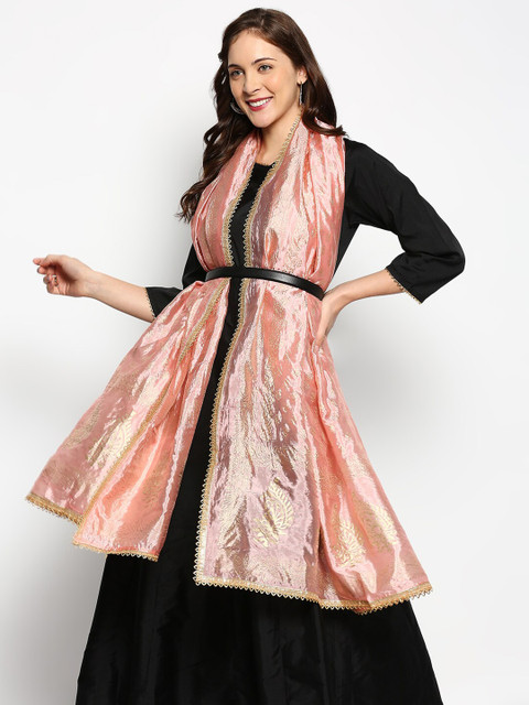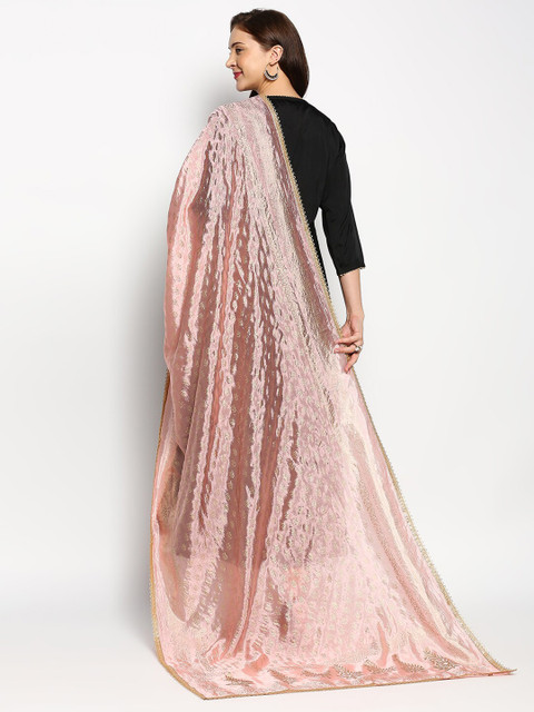 Peach-coloured and gold-toned ethnic motifs printed dupatta has khari print technique and embellished border