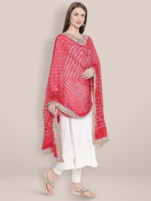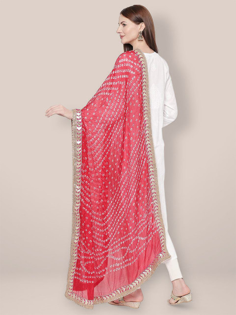 Red and white bandhani printed dupatta has bandhani technique, gotta patti, embellished border