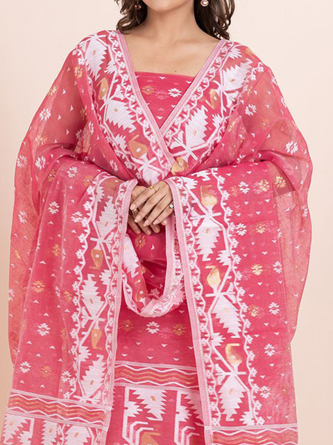 Jamdani Unstitched set features woven jamdani pink with florals. Geometric motifs and includes an unstitched kurti and dupatta but does not include the bottom material. You can pair it with your existing bottoms,palazzo,or leggings ! Disclaimer: Images are for referral purposes only. The actual product is unstitched