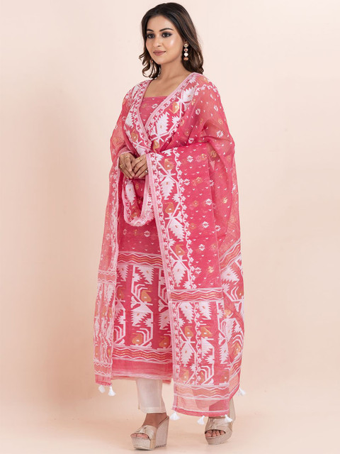 Durga Handloom Jamdani Woven Design Zari Pure Cotton Unstitched Kurti with Dupatta Dress Material