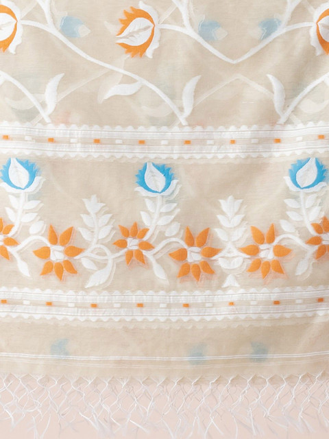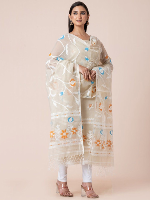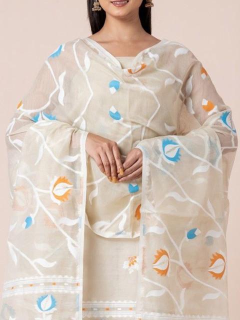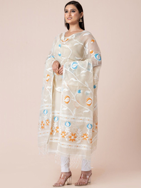 Jamdani Unstitched set features woven jamdani cream, blue and black with Florals & Geometric motifs unstitched kurti and dupatta material