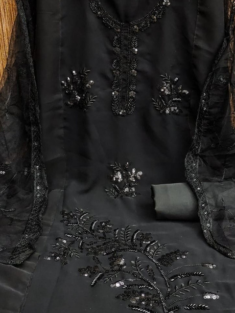 Top length – 50, Width – 2.5 mtr / Bottom length – 44 , Width 4 mtr / Dupata – 2.25 mtr / Description – Unstiched Fabric Provided , Stich Your Own Measurements