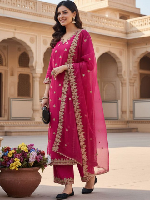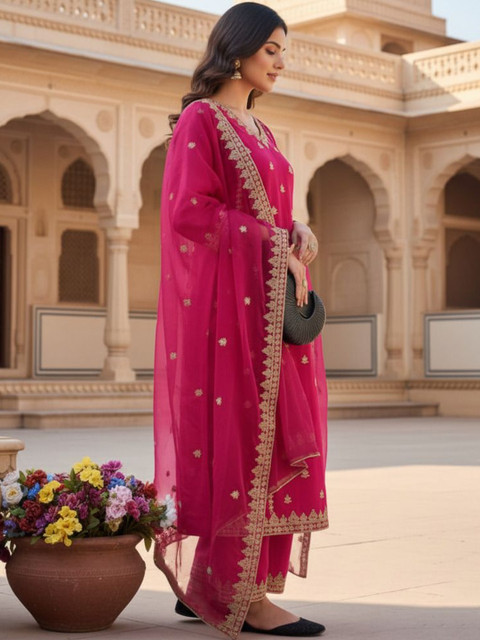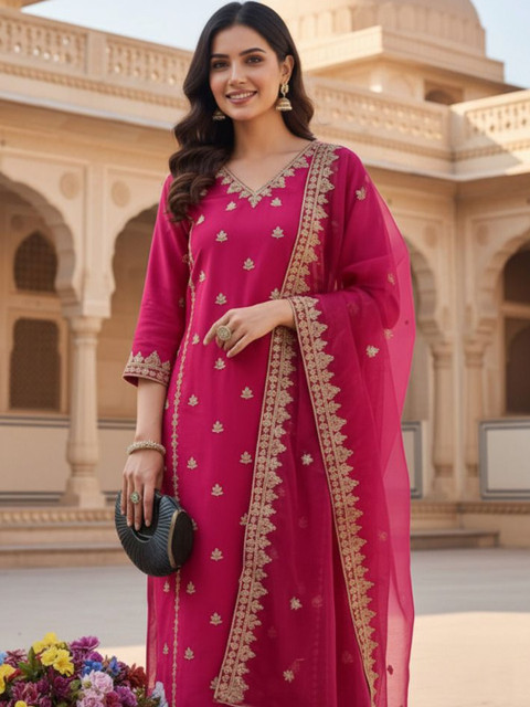 Sangria Embroidered Round Neck Kurta & Trousers With Dupatta