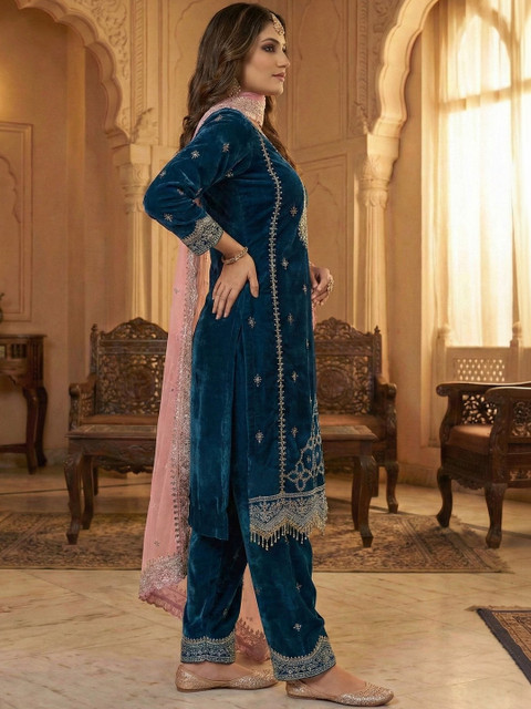 Ecolors Fab Women Ethnic Motifs Embroidered Regular Velvet Kurta with Patiala & With Dupatta