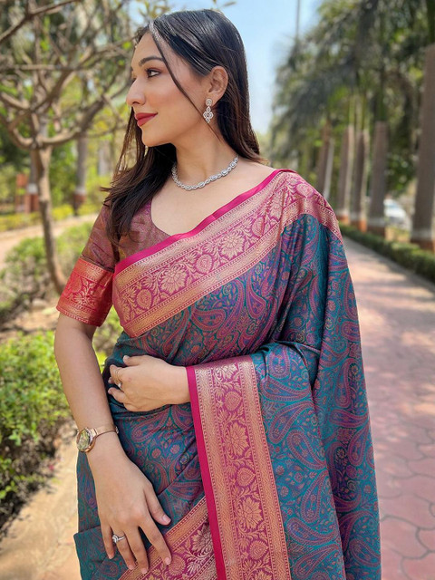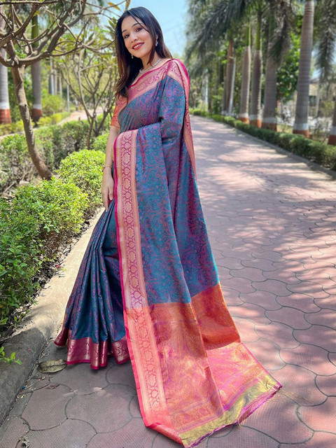 - Blue and gold-toned kanjeevaram saree