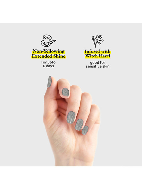 | Benefits | It a smooth luscious texture that runs down your nails like a dream.It dries in a jiffy leaving behind a perfect nail coat that stays on for days.Seals the color to give you a long-lasting shine, and our flat round brush is perfect for a flawless one-stroke application.Enriched with Witch Hazel and Vitamin E extract, it makes the nails healthy and strong while also making them look pretty.Chip-resistantNon-yellowing |