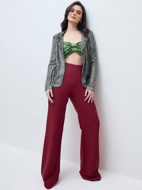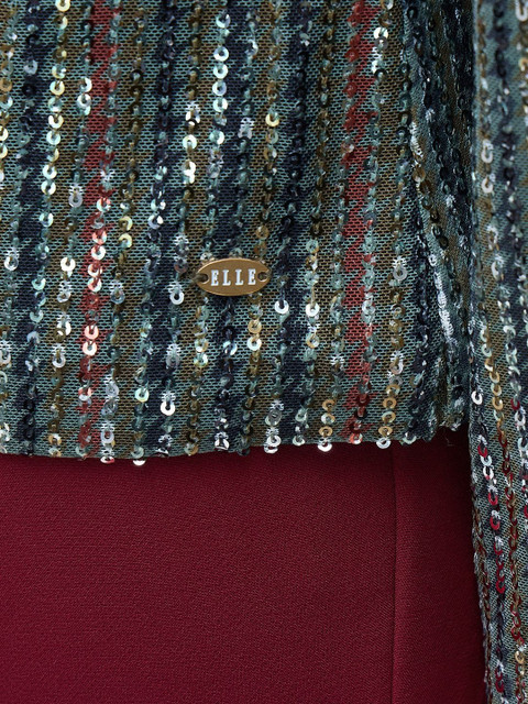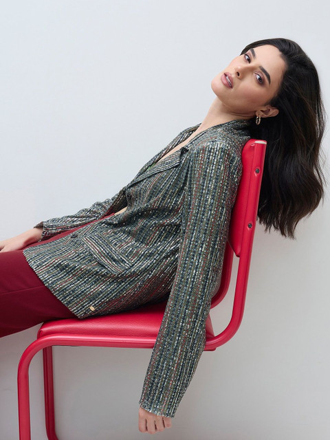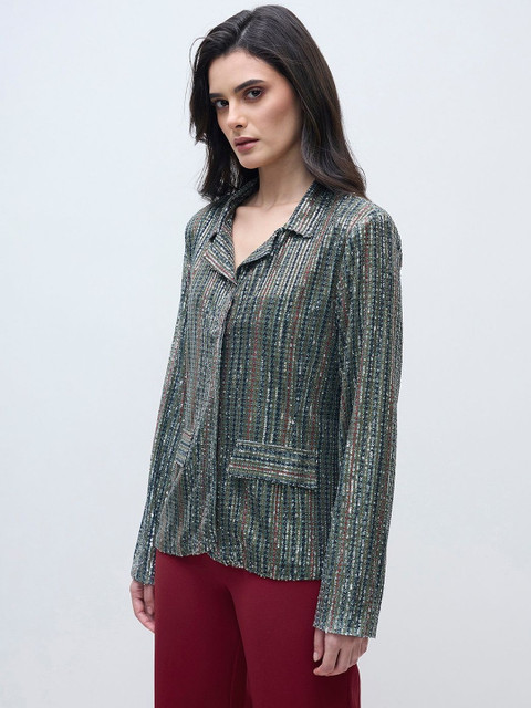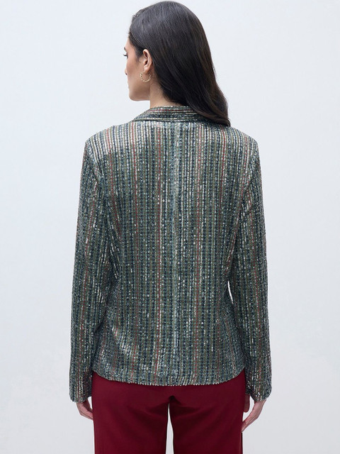 Green embellished regular Fit blazer, has a notched lapel, long sleeves, single-breasted with double button closure, two flap pockets, one welt pocket and a ventless details