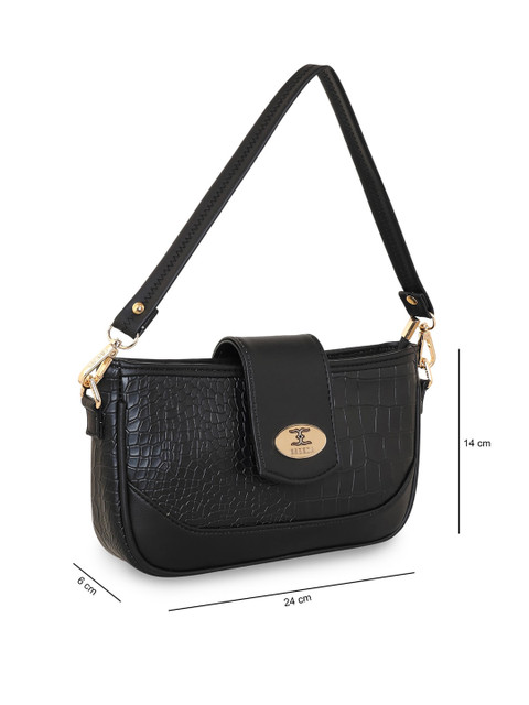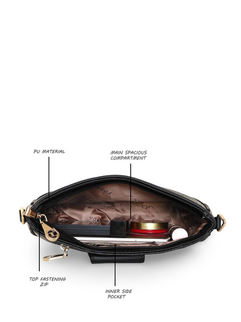 Classic black textured sling bag with one compartment and small handle. Extra detachable strap also there.