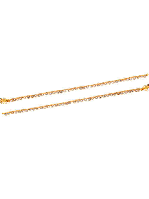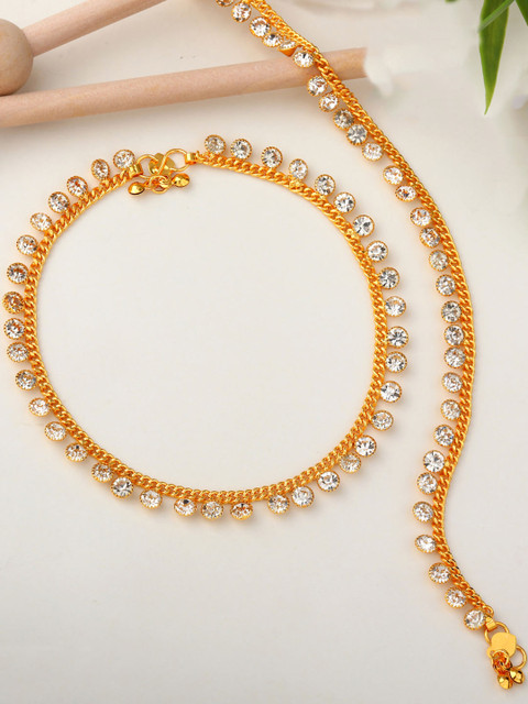 Gold toned and white crystals studded and ghungroo beaded anklets