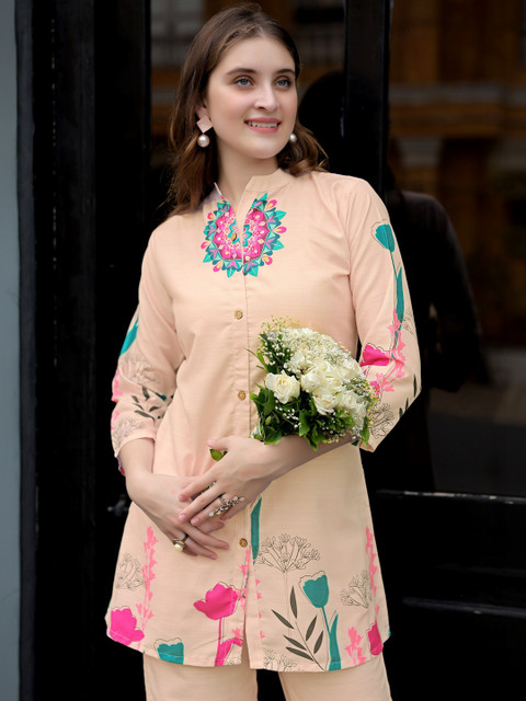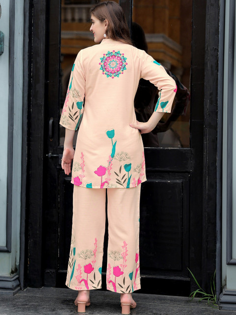 Cream printed tunic, has a mandarin collar neck and three quarter sleeves, secured with button closure