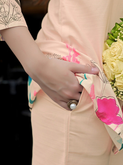 Complement the vibrant pink prints by wearing matching pink stud earrings and neutral-toned block heels or strappy sandals.
