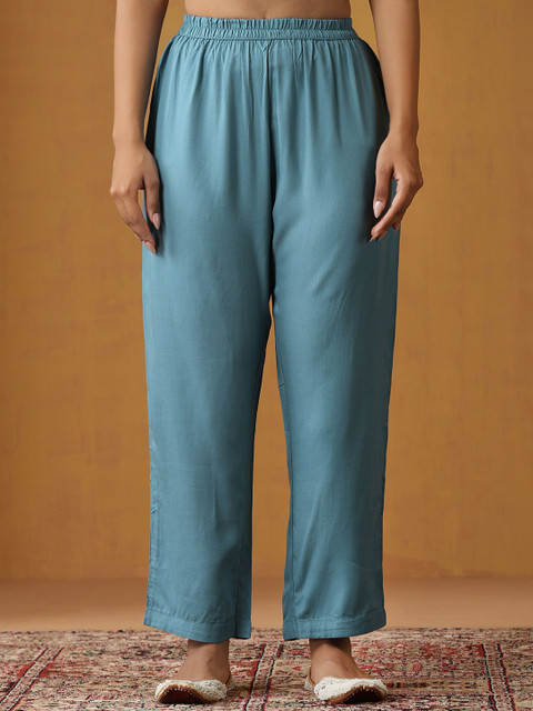 Blue and white solid trousers, has an elasticated waistband with a slip on closure