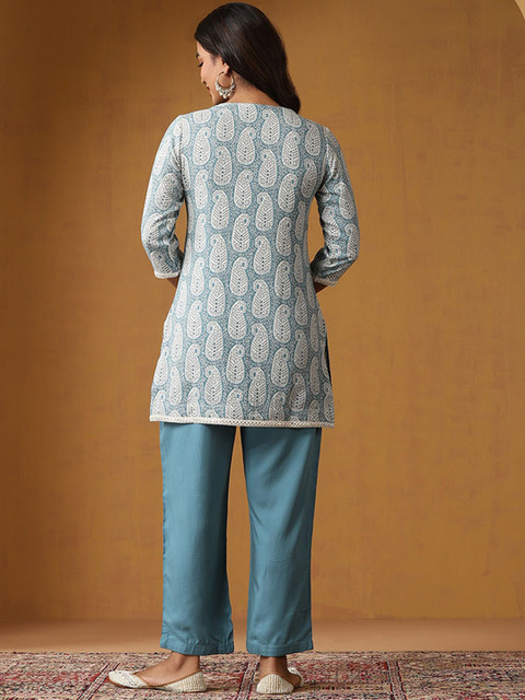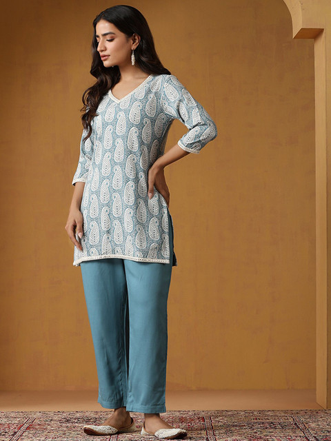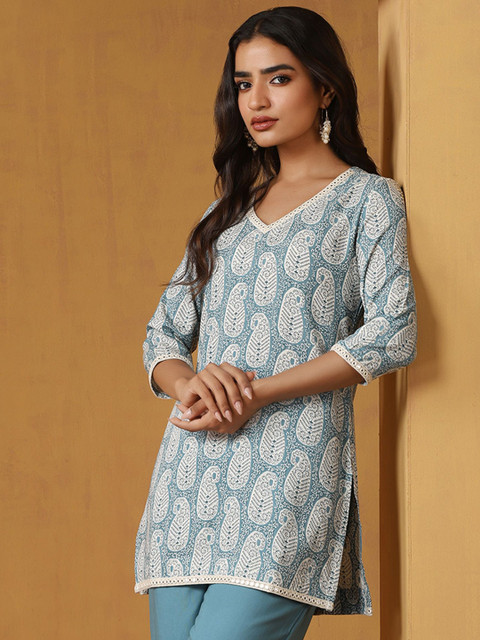 Blue and white paisley printed top , has a v-neck, has three quarter, regular sleeves
