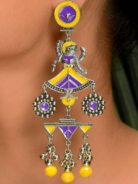 Yellow and purple geometric drop earrings, has artificial beads details