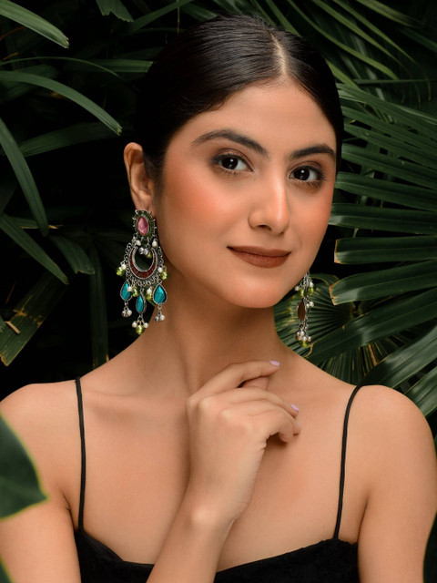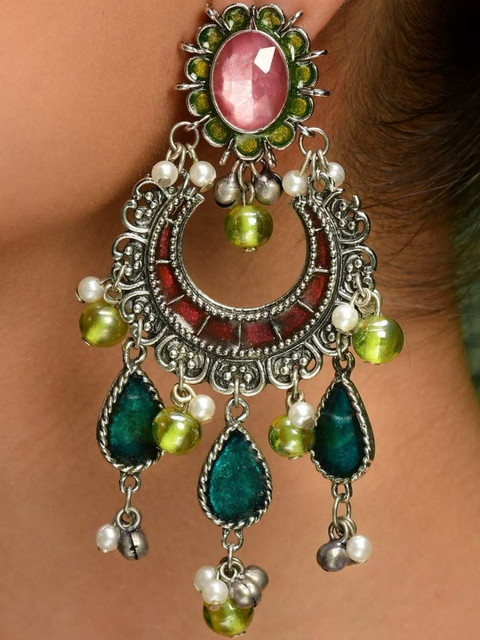 Silver-toned, red and green geometric drop earrings, has artificial beaded details