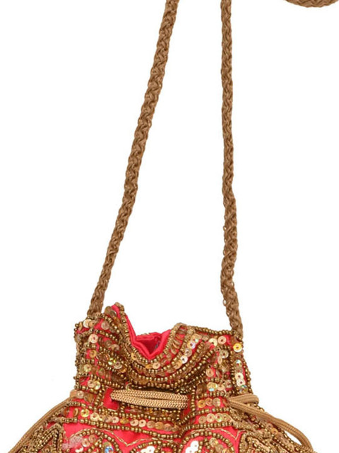 Accessorize your look with a queenly element, with this designer drawstring Potli bag, a symbol of regalia and opulence. The satin fabric of the bag has been embellished with finely shimmering sequins and beads, to match the glamour of your ethnic look.designer drawstring satin potli bag with embroidered-beads and sequins