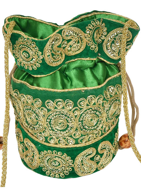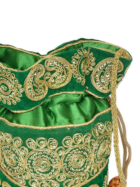 Green and gold-toned embroidered potli bag, has sequinned detail