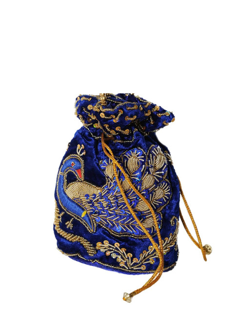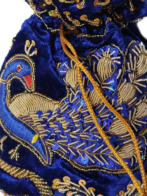 Blue and gold-toned peacock zardozi embroidered potli bag, has sequinned detail