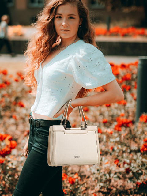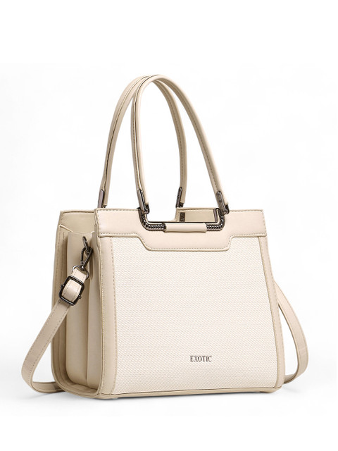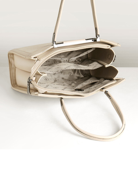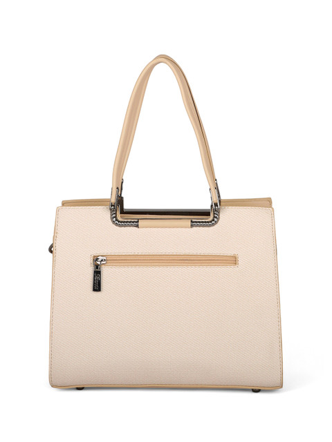 Beige brand logo self design shoulder bag, with zip detail detail