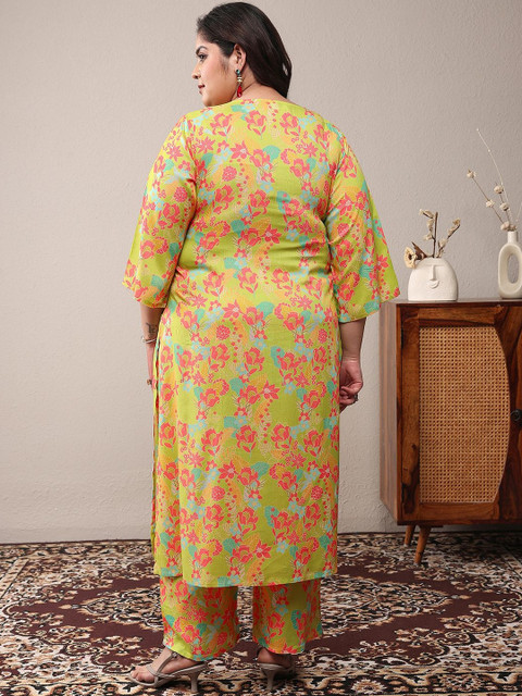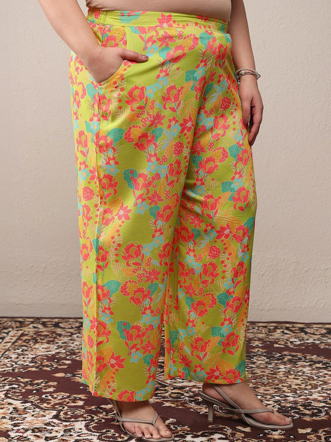 Green, pink and blue floral printed trousers, has an partially elasticated waistband with slip-on closure