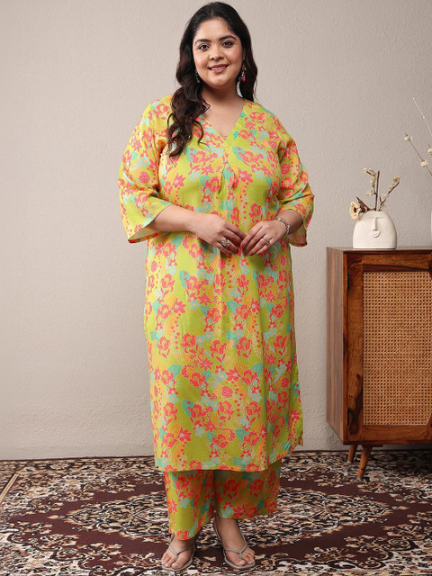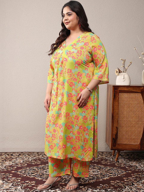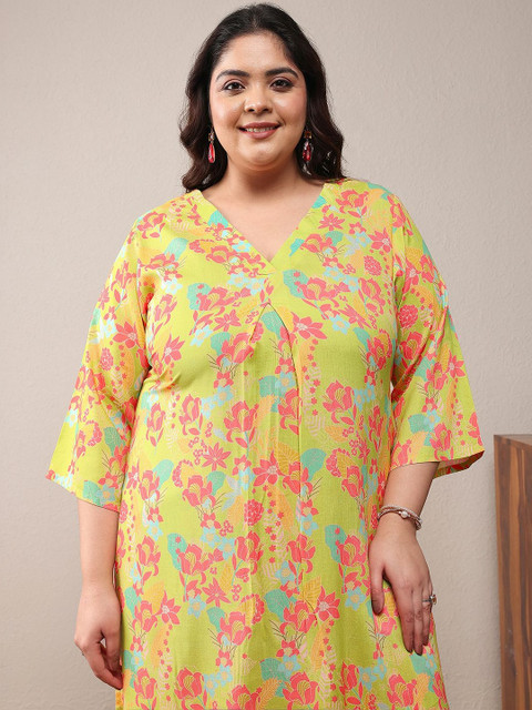 Green, pink and blue floral printed long tunic, has a V neck and three-quarter sleeves