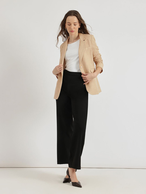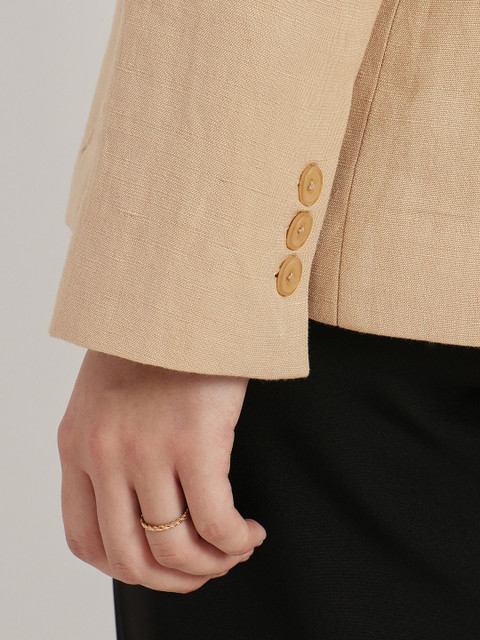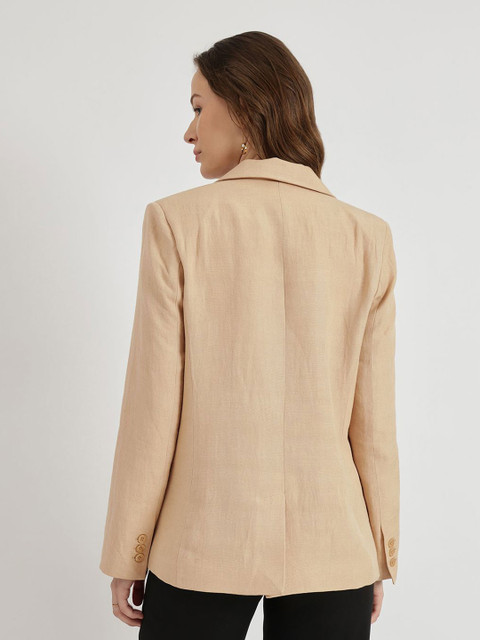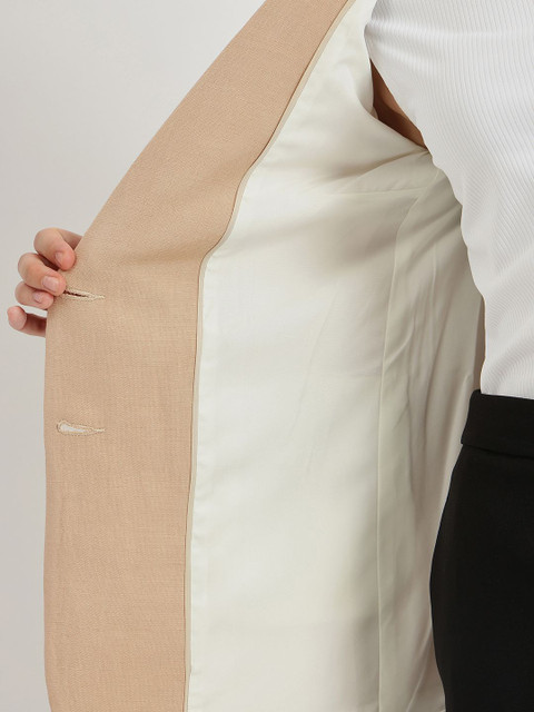 Beige solid regular-fit formal blazer, has notched lapel collar, long sleeves, single-breasted with front open, one welt and two flap pockets, has ventless