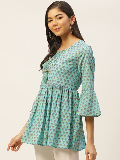 3 reviews for FABRIC FITOOR Blue & Purple Printed Tie-Up Neck Bell Sleeves Pure Cotton A-Line Top
