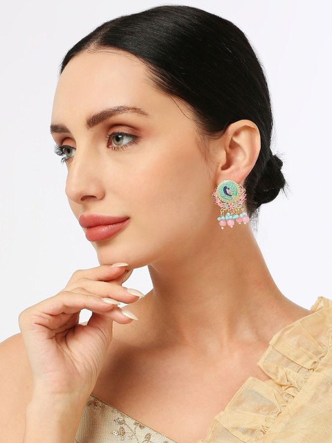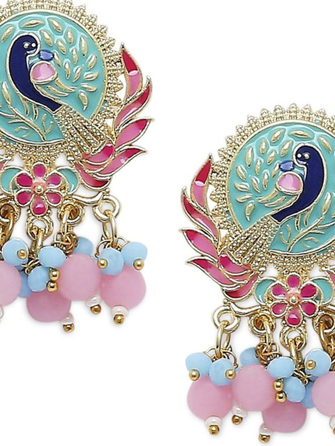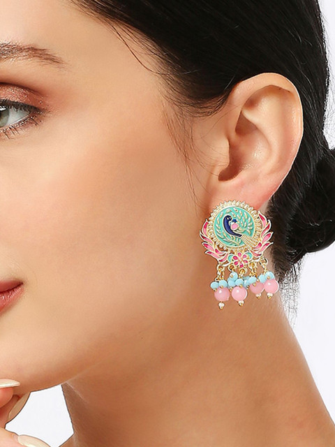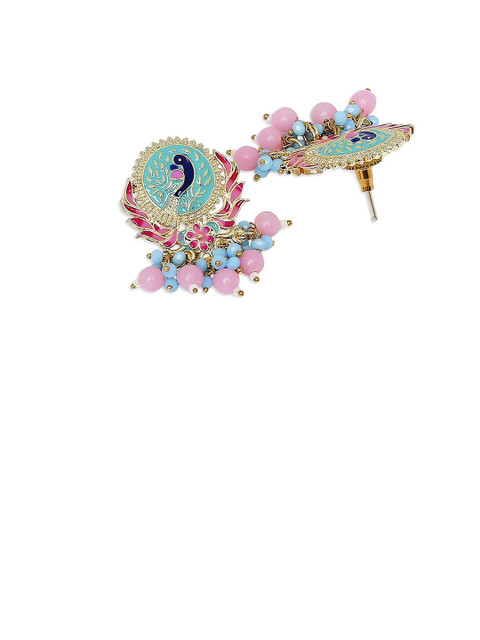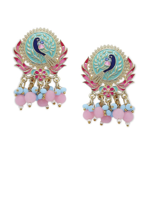 Silver toned, pink and blue circular shaped meenakari drop earrings, has artificial beaded details